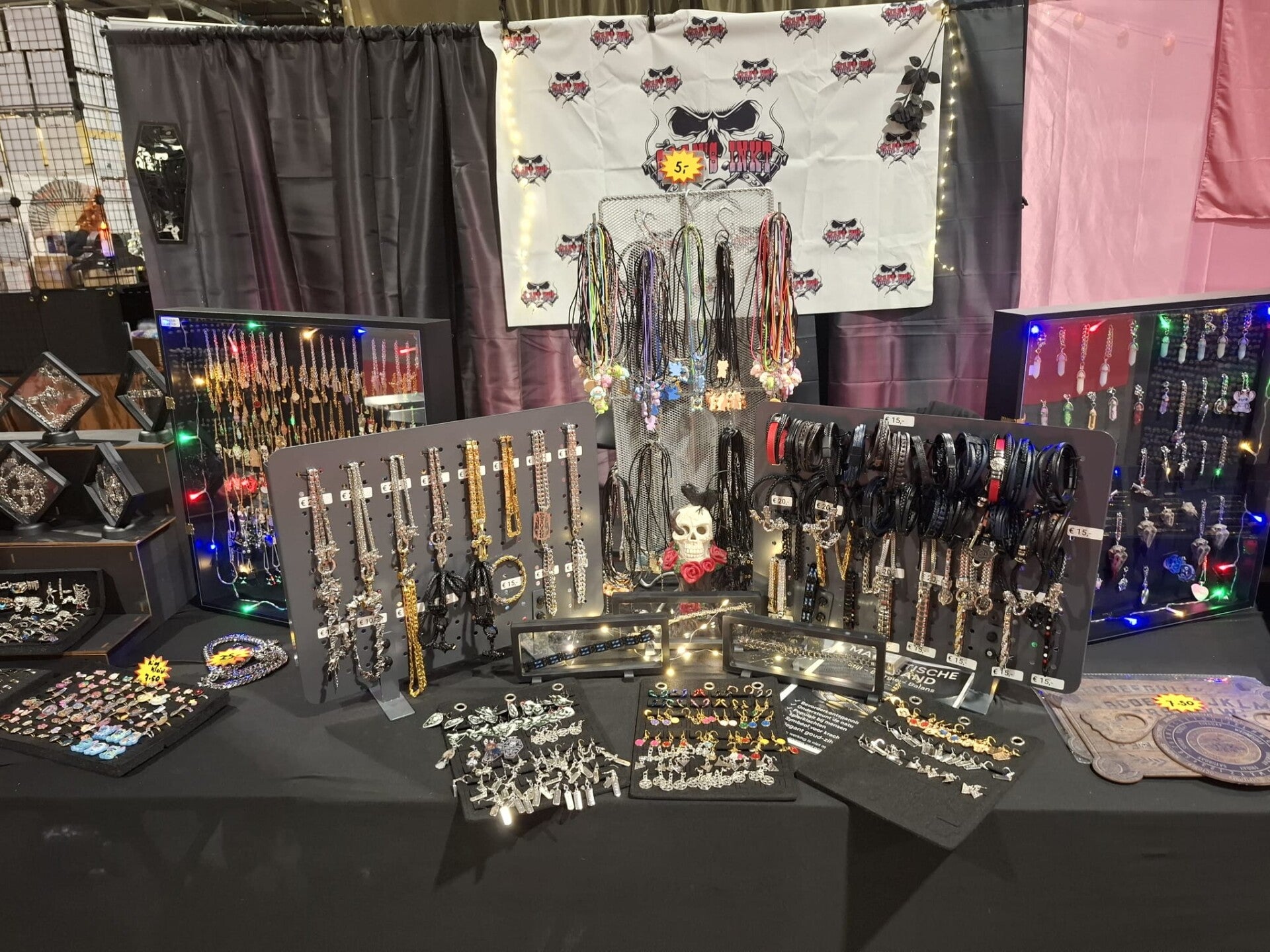 Wie onze booth binnenstapt, belandt in een wereld vol bijzondere items die je nergens anders vindt. Elk sieraad is met de hand gemaakt, met oog voor detail en liefde voor het vak. Display’s vol ringen, sieraden in zwevende frames, glinsterende kettingen en kleurrijke fantasy-accessoires zorgen voor een magische marktbeleving. Fans vinden hier altijd precies dat ene perfecte item dat hun outfit, of cosplay, compleet maakt.