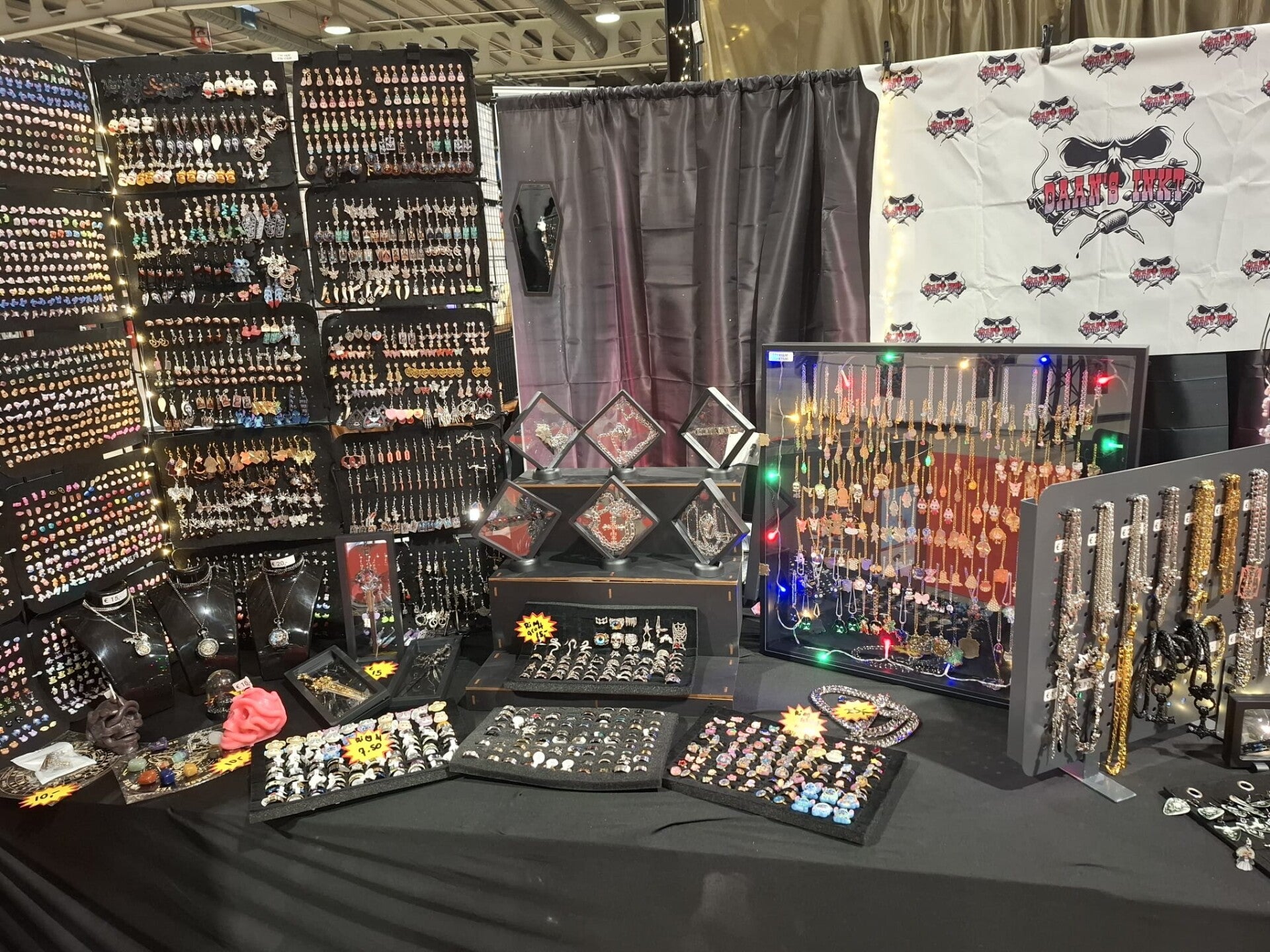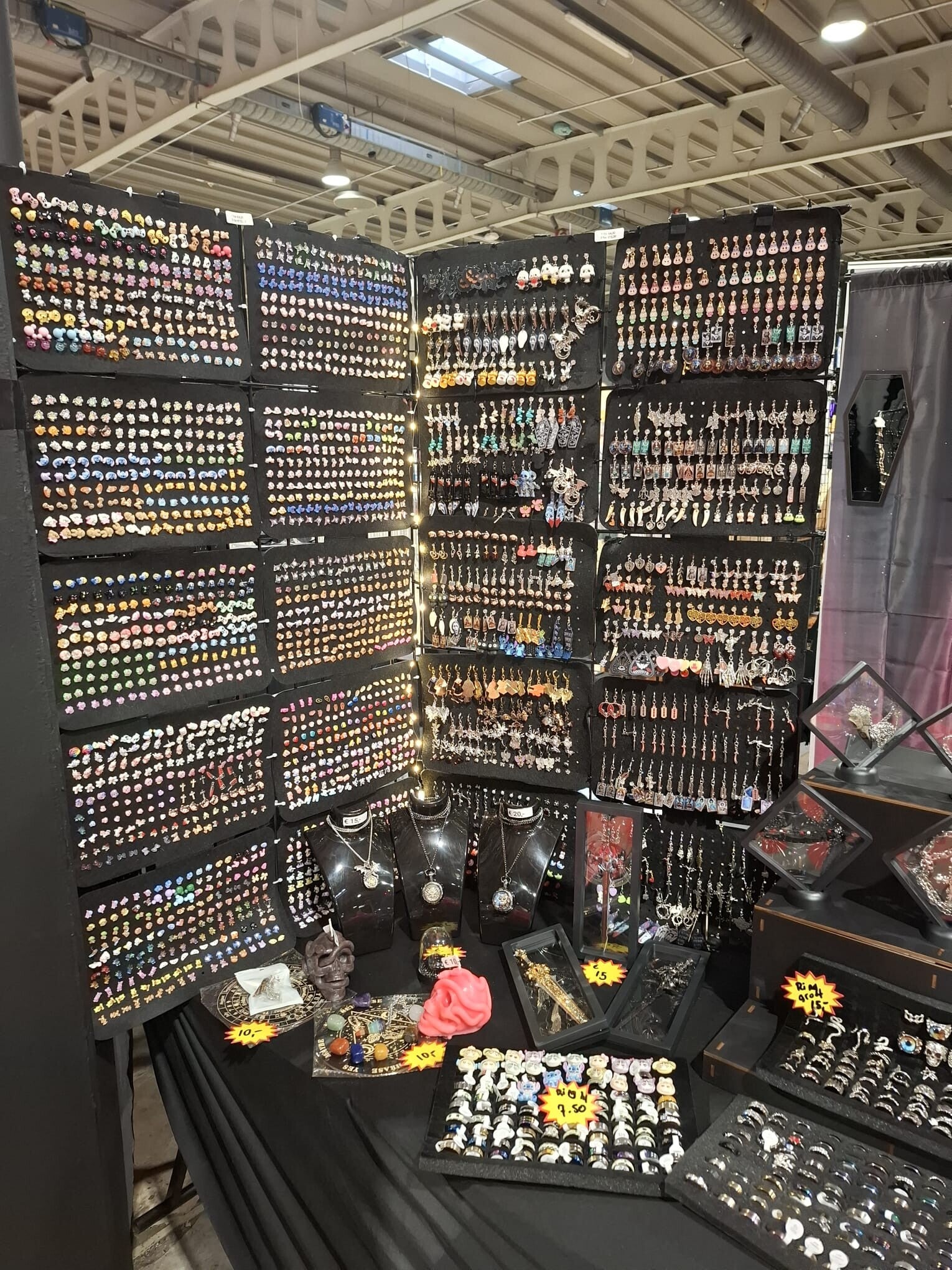 Onze booth is niet te missen: meters vol handgemaakte sieraden, unieke designs en opvallende kleuren trekken direct de aandacht van voorbijgangers. Van schattige plugs en studs tot prachtige kettingen en statement-oorbellen, alles straalt creativiteit, vakmanschap en fandom vibes uit. Bezoekers blijven massaal stilstaan om te kijken, te voelen en te shoppen. Onze stand staat letterlijk te shinen tussen alle drukte!